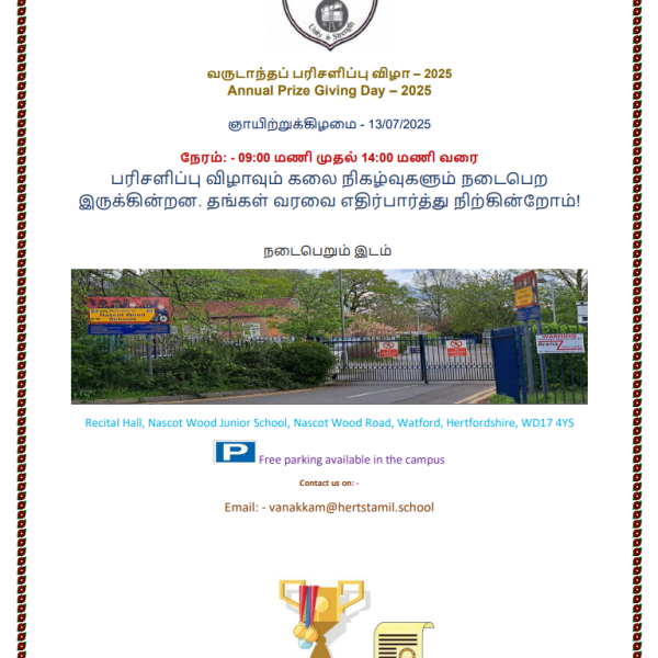 Since 1985, Herts Tamil School has been teaching Tamil and Fine Arts to the strong community of Tamils in and around Watford. Parents are proud to see their children grow confidently with Tamil. Pupils enjoy Speaking, Reading and Writing Tamil with fellow classmates. Teachers remain motivated to see their pupils…Continue reading “Our School”
