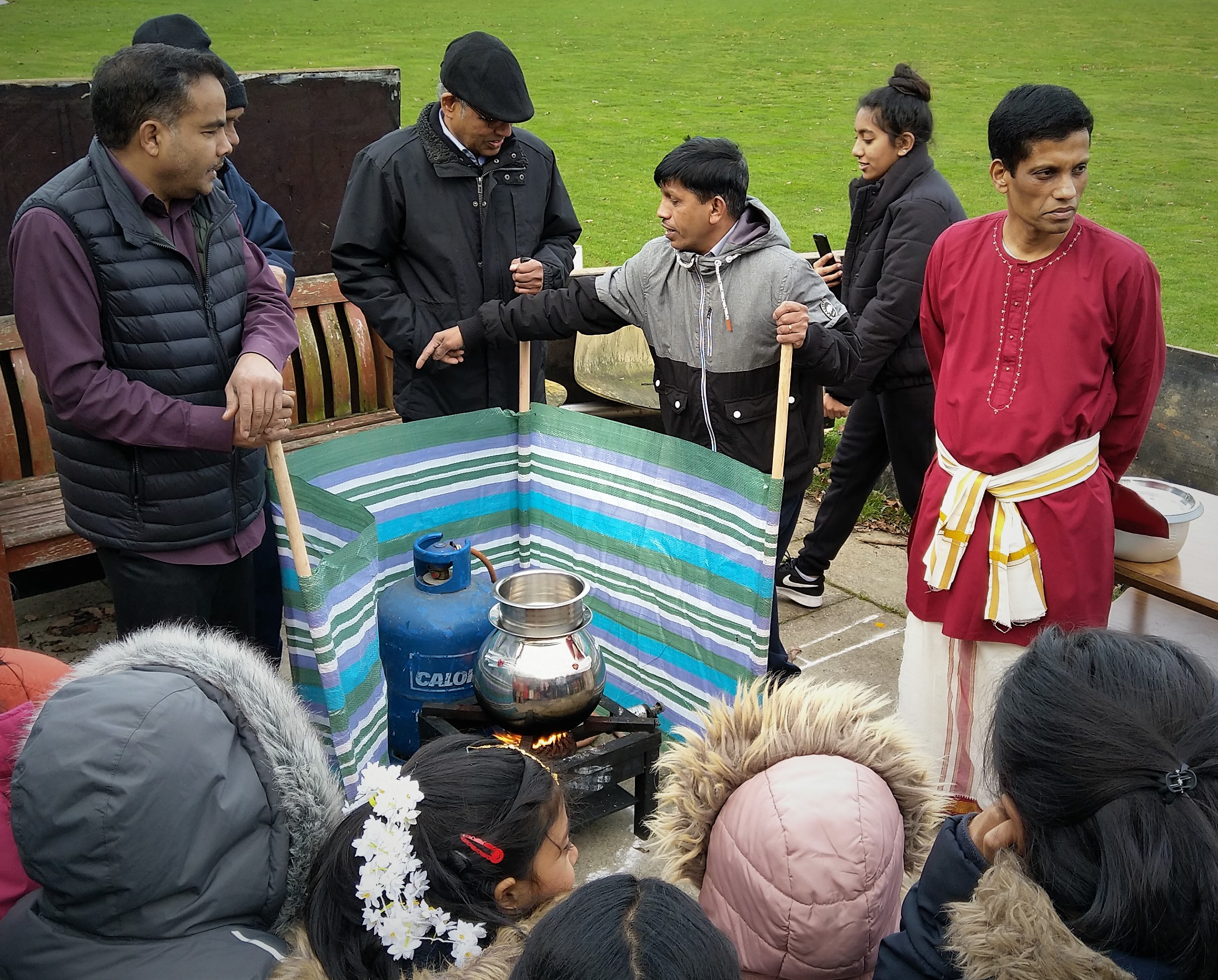 Having being tipped off in the last minute, we couldn’t believe that a Pongal celebration was happening so close to our home, so I, with my family, rushed back from John Lewis just in time to witness the பொங்கலோ பொங்கல் moment. The singing of folk songs has left a lasting impression upon me and I am longing to be part of the next community event. Needless to say the food was delicious too.