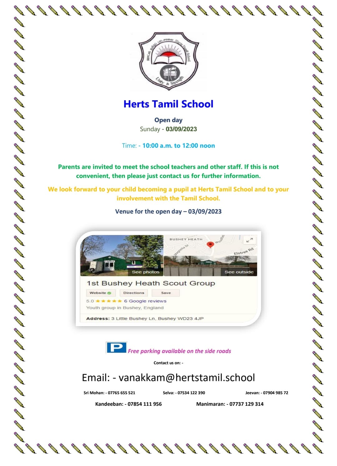 Calling the attention of all Tamilians in Watford and other areas near and far in Hertfordshire. We are delighted to organise an Open Day on Sunday, 3rd September 2023. You and your children can drop-in and experience the school on this day. All the teachers will be there to answer your questions too. The invite for this special day in our annual calendar is below.